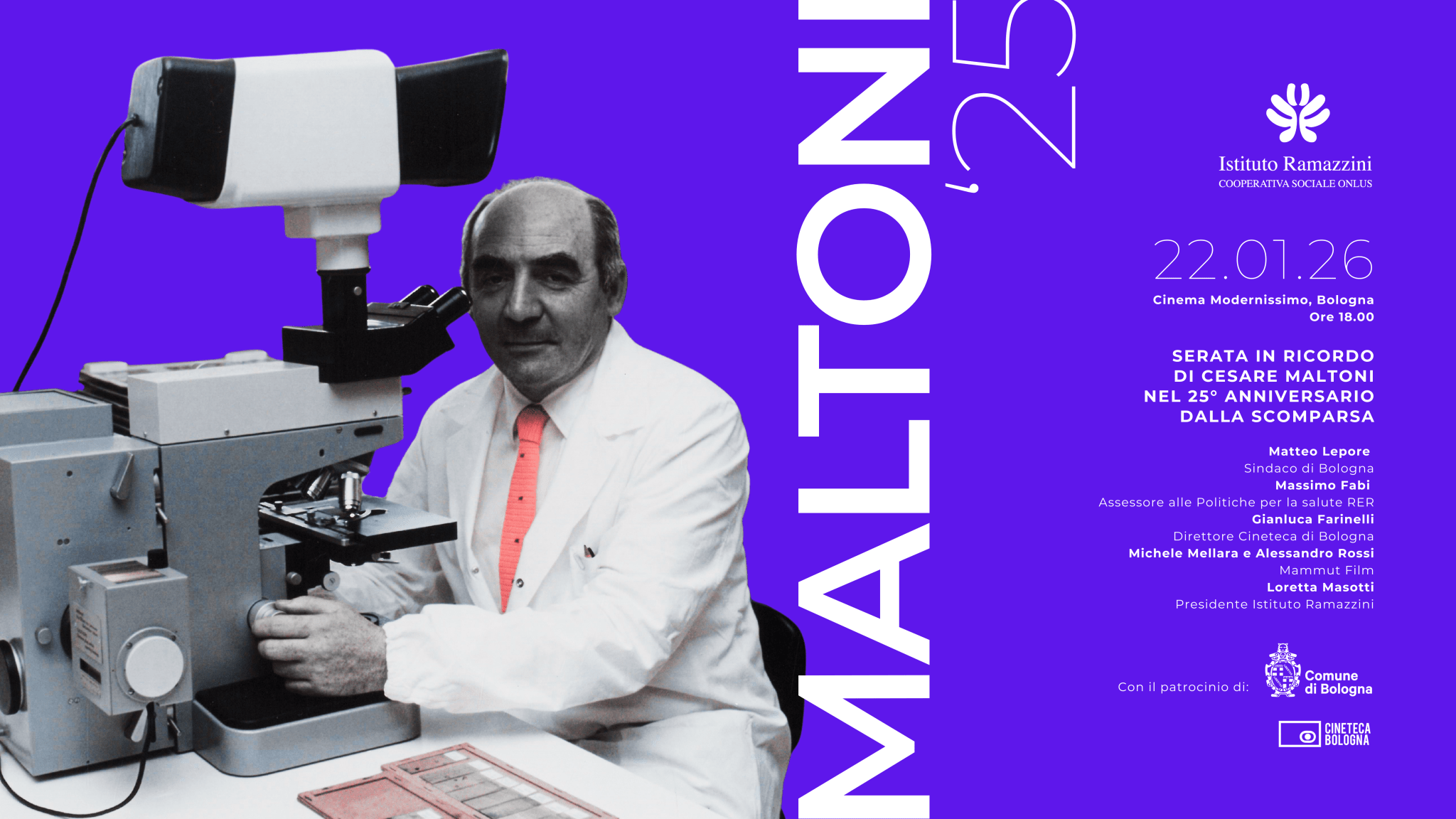 🎬 A seguire, proiezione del film “Vivere che rischio” di Michele Mellara e Alessandro Rossi, dedicato alla figura e all’eredità scientifica di Maltoni.