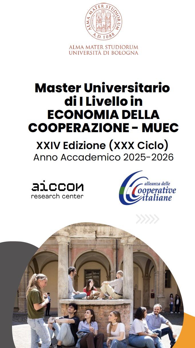 Al via la XXIV edizione del Master di I livello in Economia della Cooperazione (MUEC), promosso congiuntamente dai Dipartimenti di Scienze Economiche e di Scienze Aziendali dell’Università di Bologna e realizzato con la collaborazione di AICCON, con il sostegno dell’Alleanza delle Cooperative Italiane e delle tre Associazioni che la compongono (AGCI, Confcooperative, Legacoop).
